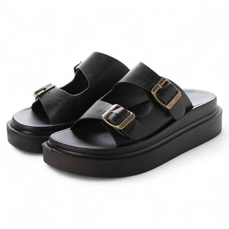 上質な素材を使用したダブルバックルサンダル。アンティーク調のゴールドバックルがアクセントになり、ナチュラルかつ高級感のある仕上がりです。フットベッドにはクッション性の高いブラックソールを採用し、長時間の歩行でも快適な履き心地を実現。ボリューム感のある厚底ソールはスタイルアップ効果も抜群で、カジュアルからモードまで幅広く対応します。