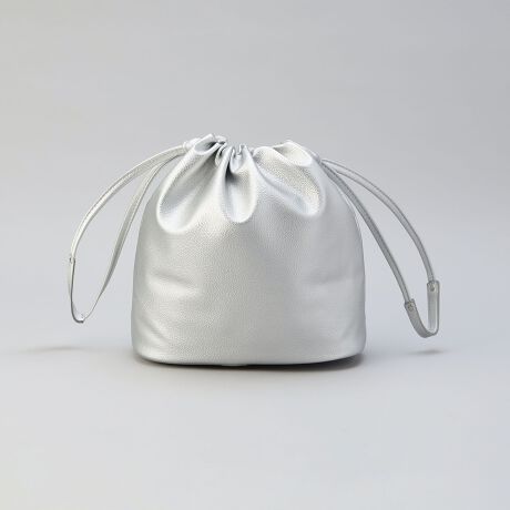 ミニマルな巾着型にレザーライクな質感を掛け合わせ、軽やかさときちんと感を両立。