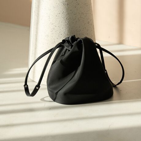 ミニマルな巾着型にレザーライクな質感を掛け合わせ、軽やかさときちんと感を両立。