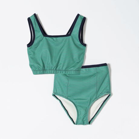 レトロなマルチボーダーが可愛いタンクトップとショーツセットのスイムウェア。