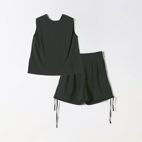 前後2WAYで着用できるノースリーブトップスと、ハイウエストのキュロットのセットアップ。