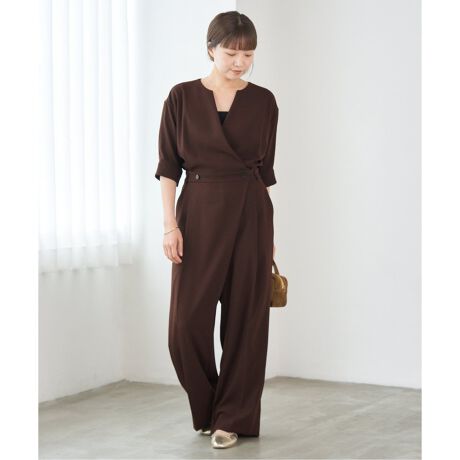 カシュクールデザインが効いた一枚でサマになるオールインワン。