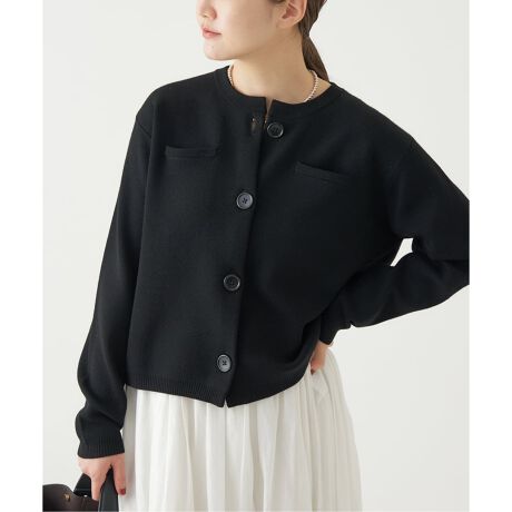 新型のクルーネックカーディガンは、大胆に大きなボタンと胸元のポケットがデザインポイントです。