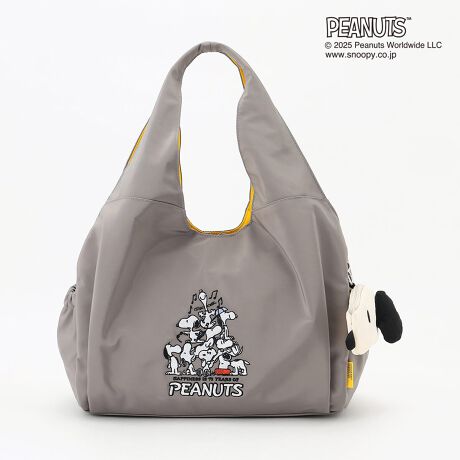 気軽に使えるナイロン素材に前面のスヌーピーのイラストの刺繍とスヌーピーのフェイス型ミニポーチがポイント。