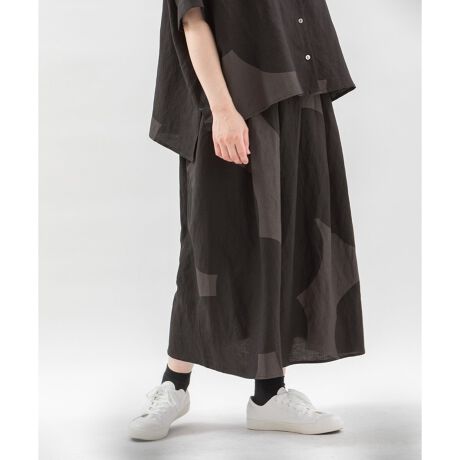 大きなドットを並べた大胆なもくもく柄のオリジナルプリントテキスタイルスカート。程よい張りと落ち感があり、きれいめでありながらナチュラル感もあるリネンレーヨンを使用。広がり過ぎず、すっきりとしたボリュームのタックスカートです。ウエストはゴム仕様で、紐先に付いた六角モチーフもさりげないポイントに。片側のみ、スカラップステッチ入りのポケットがついています。