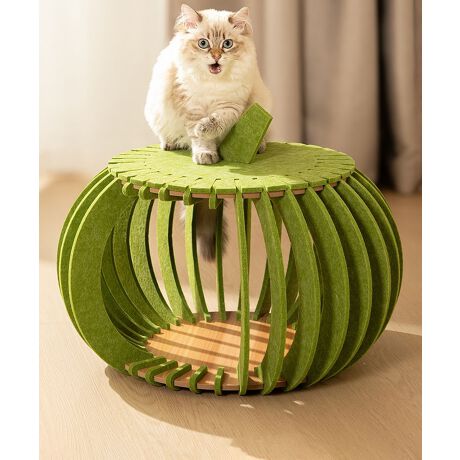 可愛らしいかぼちゃ型のデザインが特徴の猫ハウスです。通気性に優れたフェルト素材でできており、爪とぎもできる設計です。上部は座るスペースとしても利用でき、猫の休憩や遊び場にぴったり。インテリアにもなじむナチュラルな色合いで、お部屋に置くだけで癒しの空間を演出します。