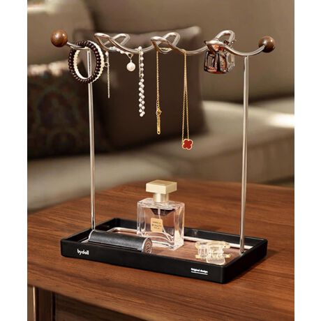 波打つようなデザインが目を引く、スタイリッシュなジュエリースタンドです。ネックレスやブレスレット、腕時計などを美しくディスプレイできる3連バー構造で、見た目の美しさと実用性を兼ね備えています。