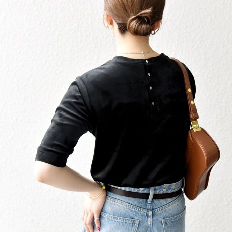 フロントはシンプルなクルーネックですが、バックにボタンディテールを入れてアクセントに◎