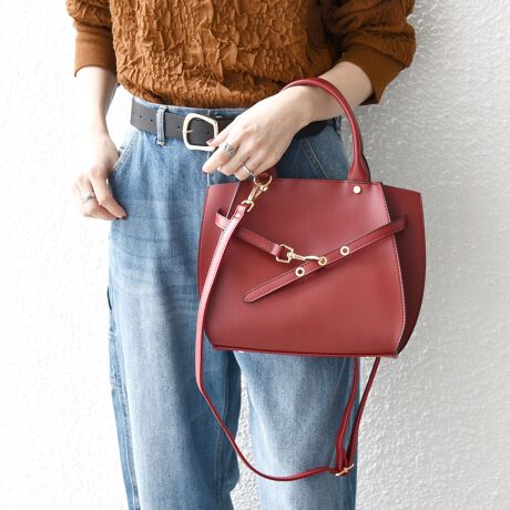 フロントの華奢なベルトが上品さを引き立てるハンドバッグ。
