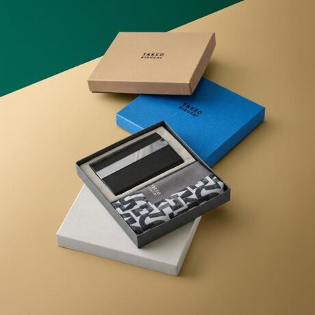 それぞれハンカチの色をイメージしたキャッチーな貼り箱を使用。