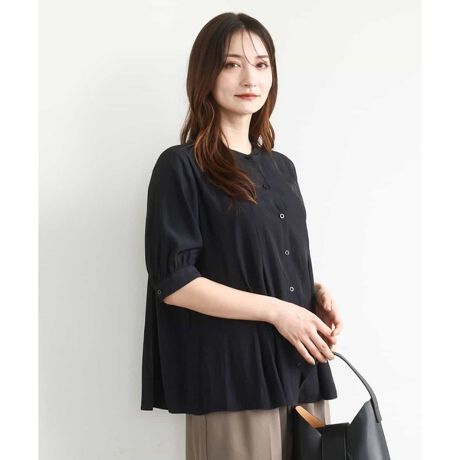 後ろ身頃がプリーツデザインで、風を通して涼しく着られるブラウス。きちんと見えながら、ヒップが隠れる着丈で体型カバーも叶います。