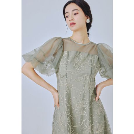 透け感のあるチュール素材に切り替えたパフスリーブが目を惹きます。