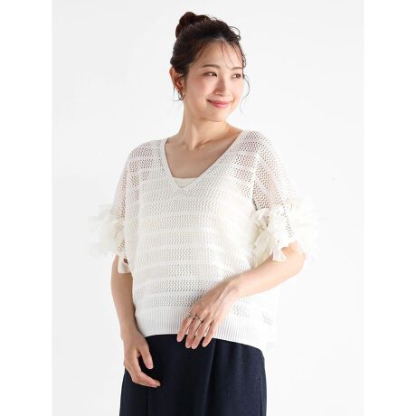袖リボンメッシュニット