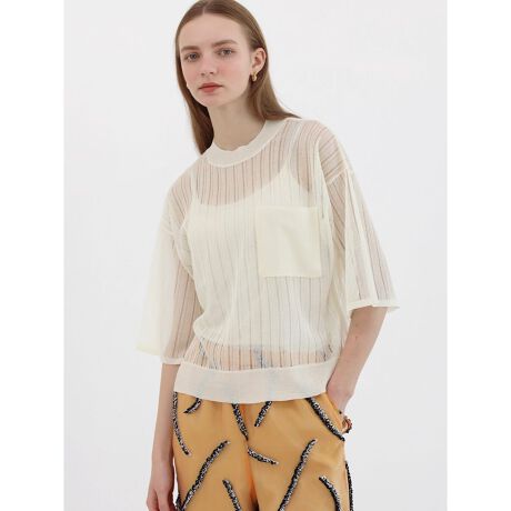 繊細な透かし編みニットに大ぶりのポケットがポイントのアイテム。ストライプ調の網目がボディーラインをぼかしナチュラルな肌見せを実現。リブとのコントラストが女性らしさを演出し、これからの季節に使用して頂ける一着です。