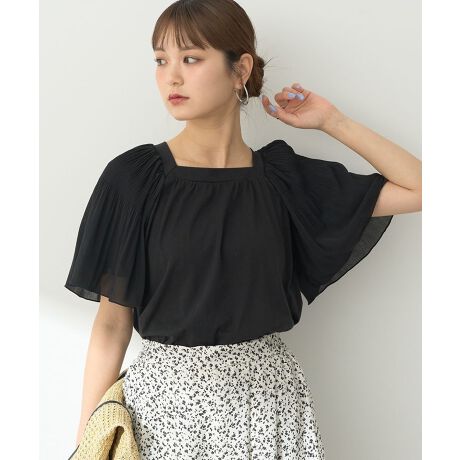 マジョリカプリーツを施したフレア袖がキュートなカットプルオーバー。すっきりとしたスクエアネックがデコルテラインを美しく魅せてくれます。肌触りの良いコットン100%素材にシアー布帛をジョイントした軽やかな着用感も魅力的。締め付けのないAラインシルエットでボディラインを拾わないのも嬉しいポイントです。透け感[ややあり]