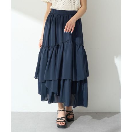 ふんわりと重なるティアードヘムラインが華やかさ溢れるフレアスカート。アシンメトリーの切り替えラインにフリルを施し、フェミニンな雰囲気に仕上げました。バックゴムのリラクシーな着用感に加え、肌滑りの良い裏地付きなのも嬉しいポイント。上品な透け感がスタイリングに軽やかさを加えてくれるおすすめのアイテムです。透け感[ややあり]