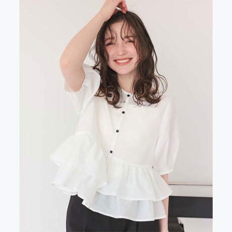 ・上品な、程よく張り感のあるシアー素材で、軽やかな印象のブラウス。・袖はランタンスリーブで、丸みのあるレディな印象に。・ペプラム切り替えのフリルで、スタイルアップ効果も◎・丈感とバランスにこだわったブラウスです。[型番:AFXP4342]