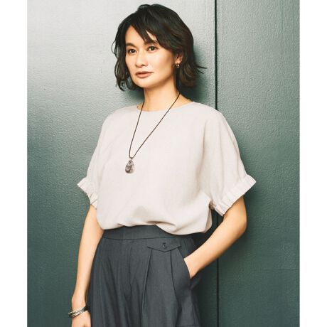 ナチュラルな素材の表情と程よい抜け感が大人っぽいTブラウス■デザインドルマンスリーブの袖口にゴムギャザーを寄せた、シンプルながら程よい華やかさを感じられるTブラウスです。ドルマンスリーブならではの抜け感を感じられるシルエットと、透けすぎない程よい凹凸感のあるメッシュ素材が大人っぽい印象です。後ろのメタルファスナーをポイントにした、1枚で着映えるデザインです。■素材アセテートと梳毛調のポリエステルを使ったメッシュ素材です。スラブ糸を一緒に織り込むことで、麻のようなナチュラルな表情と繊細な立体感、リラックスしたストレッチ感があるのが特長の素材です。■同素材アイテムバックボウタイブラウス(BLWMGA0104)