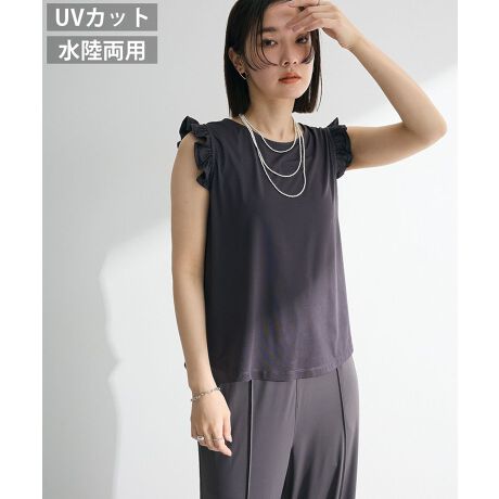 ひんやりとクールタッチなラッシュガード素材のタンクトップ。シンプルなラウンドネックにミニマムなフリル袖で甘さを加えた魅力的なデザインです。紫外線から肌を守ってくれるUVカット仕様に加え、水に濡れても乾きやすいのも嬉しいポイント。デイリーからレジャーまで幅広いシーンで活躍してくれるおすすめのアイテムです。透け感[なし]