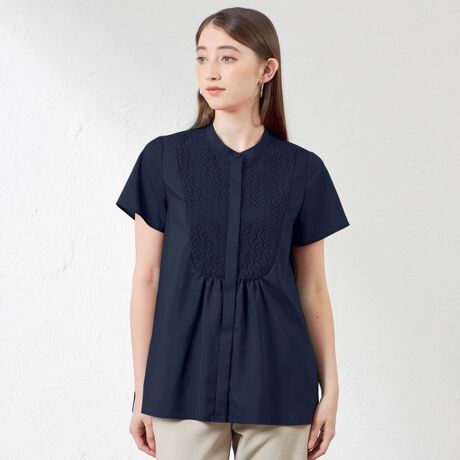 バンドカラーの半袖プルオーバーです。フロントはビブヨーク部分にフラワーモチーフのケミカルレースを重ねました。切替下にはギャザーを入れフレアラインを出して、女性らしいシルエットをつくり、また肌離れよく軽やかに着ていただけます。第一釦は共布を使用したくるみ釦を手付けで施したエレガント感と、前立ては略比翼仕立てですっきりと大人っぽく仕上げました。