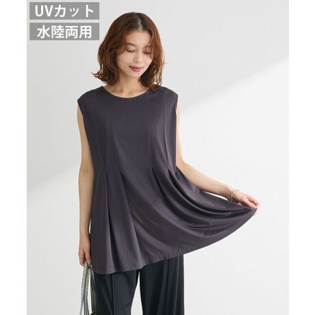レジャーシーズンに欠かせないノースリーブのラッシュガードチュニック。フロントラインに切り替えタックを施したリラクシーでメリハリあるシルエットが魅力です。ドライタッチで速乾性もあり、UVカットの機能性も嬉しいポイント。海やプールはもちろん、普段使いにも重宝するおすすめのアイテムです。透け感[なし]