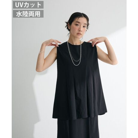 レジャーシーズンに欠かせないノースリーブのラッシュガードチュニック。フロントラインに切り替えタックを施したリラクシーでメリハリあるシルエットが魅力です。ドライタッチで速乾性もあり、UVカットの機能性も嬉しいポイント。海やプールはもちろん、普段使いにも重宝するおすすめのアイテムです。透け感[なし]