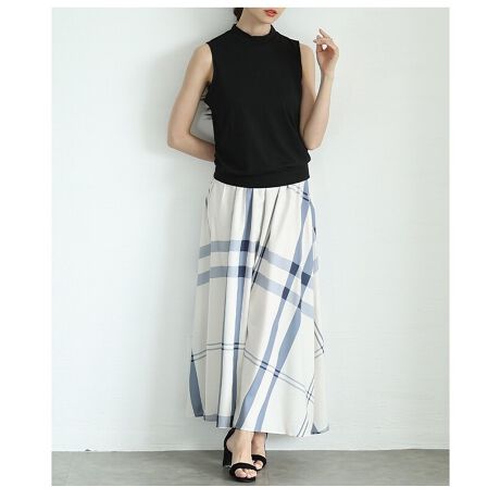 シンプルなノースリーブカットソーにカジュアルなチェック柄スカートが映えるセットアップアイテム。モックネックの首元できちんと感が漂い、伸縮性のあるカットソーだから着脱も簡単。広めのアームホールで窮屈感なく着用でき、レイヤードにもぴったり。裾にギャザーを重ね、程よくふんわりとしたシルエットでお腹周りをカバー。フィット感のある切り替えでメリハリを加えます。トレンド感のあるチェック柄が映えるスカートは、ウエストゴム仕様だからリラクシーな穿き心地。落ち感のあるふわりと広がる上品なフレアシルエットで大人っぽさを演出します。セットアップは勿論のこと、別々でも楽しめるから、コーデの幅もグンと広がります。