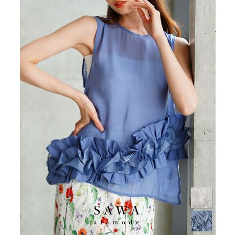 【ブラウス】 トップス シャツ 白 ホワイト 青 ブルー ノースリーブ フリル シアー 無地 夏服