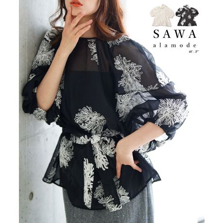 大輪の白花刺繍が美しいリボン付きシアーブラウストップス。華やかな花刺繍が目を惹く美しいデザインで女性らしくエレガント。軽やかなシアー生地でロングシーズン着用可能です。上半身をすっぽり覆うふわっと感が締め色も柔らかい印象にしてくれます。リボンは結び方を変えてアレンジ自由自在◎