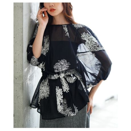 大輪の白花刺繍が美しいリボン付きシアーブラウストップス。華やかな花刺繍が目を惹く美しいデザインで女性らしくエレガント。軽やかなシアー生地でロングシーズン着用可能です。上半身をすっぽり覆うふわっと感が締め色も柔らかい印象にしてくれます。リボンは結び方を変えてアレンジ自由自在◎