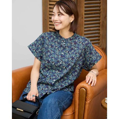 柔らかな綿レーヨン素材に、可憐な小花柄をあしらったフェミニンなブラウス。涼しげで上品な雰囲気を演出する、グリーンとネイビーの2色展開です。肩先をふんわりカバーするフレンチスリーブは女性らしいシルエットを引き立てつつ、涼しさもキープ。前開きボタン仕様で着脱しやすく羽織りとしても使える嬉しいデザインです。