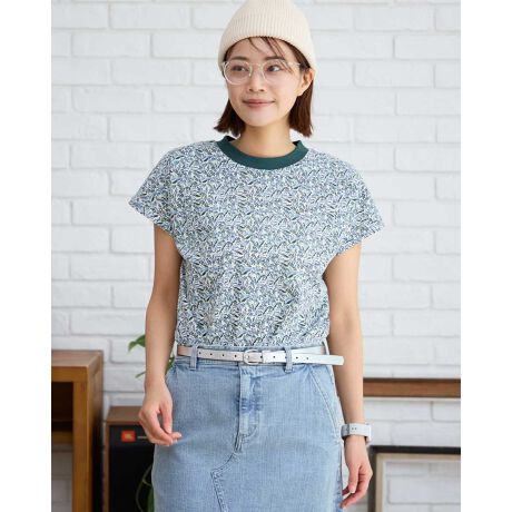 小さな花柄がやさしい雰囲気のTシャツ。袖はすっきり着用できるフレンチスリーブです。襟元には伸びのよいテレコ素材を使い、着脱もラクに。軽くて柔らかく、暑い季節も快適に過ごせます。カラーはシックな雰囲気にまとめたオレンジと、グリーンの2色展開。1枚でコーデが華やぐアイテムです。