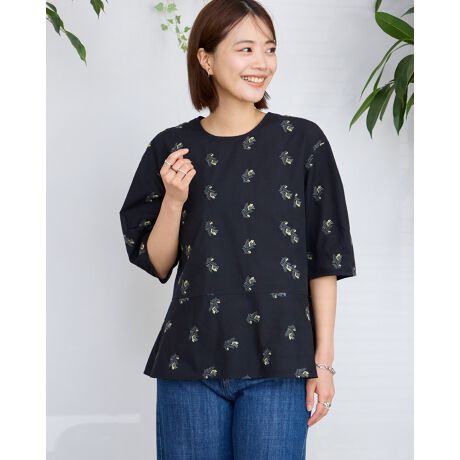 整った織り目で清潔感のあるローン地にスズランをイメージしたモチーフを刺しゅうしたブラウス。ほのかな透け感もあり、しなやかでサラリとした肌触りも魅力。両脇のパネルラインで少しフィットさせたボディに反し、裾のフレアがふんわりと広がるシルエットがフェミニンなアイテム。