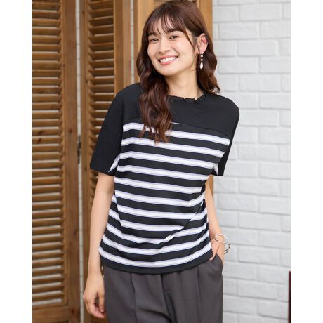 背中と前ヨークにも凹凸が可愛いサッカーの布帛をドッキングしたデザイントップス。ポツポツとした小さな凹凸が特徴的な鹿の子と、同じく凹凸を繰り返しながらヨコ方向に配色でラインを施したボーダーの生地をセレクト。ほのかなシアー感と軽いタッチが魅力です。全体的に肌離れも良くドルマンのシルエットで風が通り抜けるため涼しく、華やかにお召しいただけます。腹部やヒップを覆う着丈でパンツとのバランスが取りやすく襟元のフリルに甘さがあるためデニムやキャップなどカジュアルなアイテムとのコーデがおすすめ。乾きやすく汗をかく季節に便利な1着です。