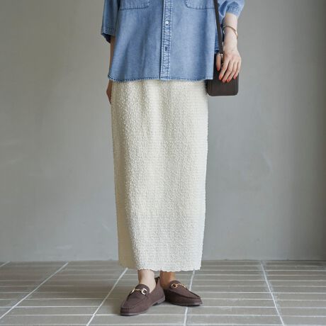 凹凸のあるシャーリング生地に表情豊かなポコポコ素材が映える、すっきりとした印象のナロースカート。