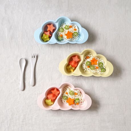 離乳食〜キッズのおやつ皿まで長く使えるサイズで、もくもくした雲の形はごはんがすくいやすい設計です。