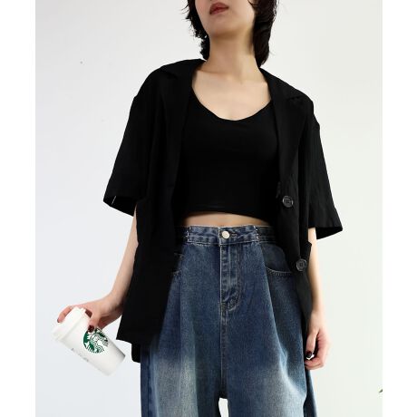 [型番:co1060a]シンプルな半袖ジャケット。レーヨンで肌ざわりがよく、羽織るだけできちんと感UP。ワンピースに羽織ったり、デニムに合わせたり様々なコーディネートが楽しめます。