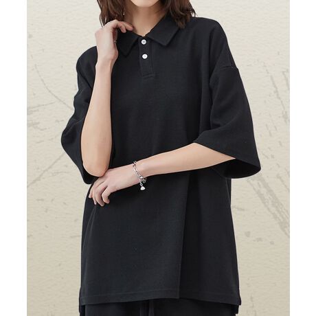 シンプルながらも洗練されたデザインが特徴のこのポロシャツは、トレンド感のあるワイドシルエットとドロップショルダーが魅力です。330Gの厚手素材を使用しており、ダイヤモンドパターンのワッフル織りがアクセントになっています。サイドスリットが入っているため、動きやすさとスタイリッシュさを兼ね備えています。