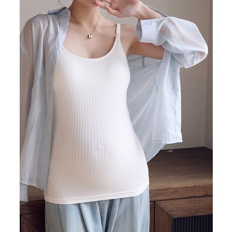 妊娠中から産後の授乳期まで長く使える、前開きリブ編みマタニティキャミソール。シンプルなデザインでインナーとしても一枚着としても活躍します。