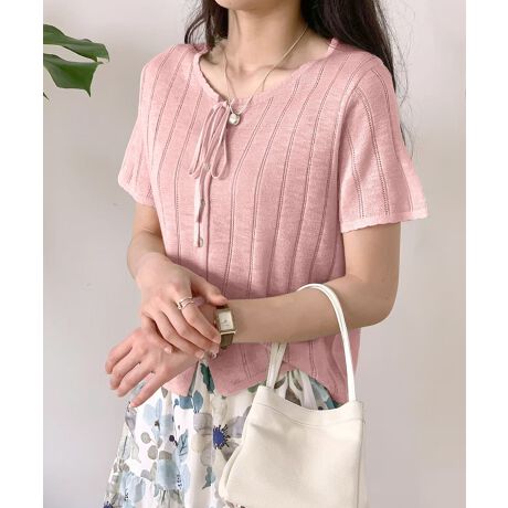 透かし編みと胸元のリボンディテールがフェミニンな雰囲気になり軽やかな半袖ニットカーディガン。程よく透け感のある編み地が、春夏の装いに抜け感をプラスします。