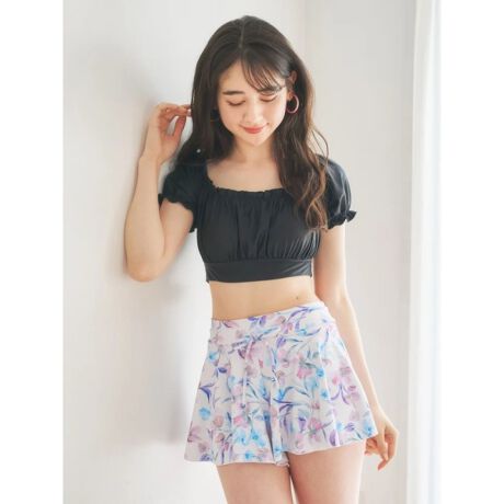 パフスリーブのブラに水彩柄のショーツとショートパンツを組み合わせた3点セット。