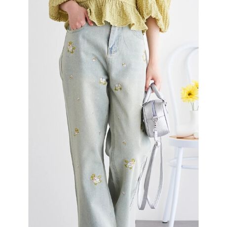 花刺繍×ラインストーンデニムパンツ