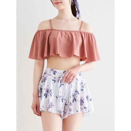 シンプルなオフショルダーブラにリゾート気分高めるフラワー柄のショーツとショートパンツを組み合わせた3点セット。