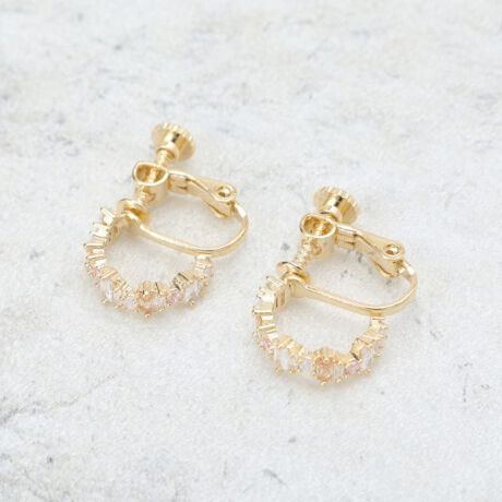 華やかなビジューを使用したねじ式イヤリングは、ほんのり色づいたビジューが美しく輝き、耳元に上品な印象を与えます。