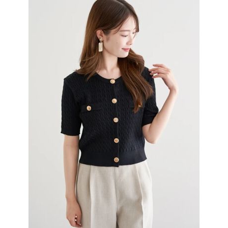 ケーブル編みデザインがが上品な雰囲気を演出するカーディガン。