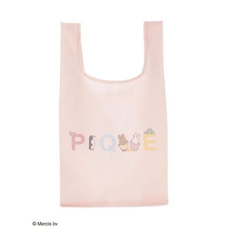 折りたたんで便利に持ち運べる、毎日のお買い物に重宝する小さめサイズのエコバッグ。フロントはPIQUEの文字にどうぶつたちが集まってきたようなロゴプリントを入りで、「I」になりきっているペンギンがポイント。背面にはコラボレーションロゴと小さなお魚をあしらいました。本体を小さく収納できる内ポケットにミッフィーのお顔をプリントしているので、折りたたんだときの見た目までキュート。色はブルーナカラーのオフホワイトと、GELATO PIQUEらしい淡いピンクの2色展開です。