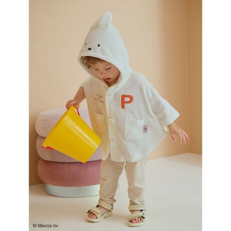 プールや海など、夏のレジャーにもおすすめのパイル素材のベビーサイズポンチョ。立体的な耳が付いたフードには、ミッフィーのお顔を刺繍で表現しています。背面にはPIQUEロゴにどうぶつたちが集まってきたようなアップリケ刺繍入りで、「I」になりきっているペンギンや、楽しそうなミッフィー&メラニーがポイント。フロントにはコラボレーションネームと「P」の刺繍が入っています。お花型のボタンは、柔らかなシリコン素材を使用。同シリーズのTシャツや総柄ショートパンツとコーディネートしたり、キッズサイズとのリンクコーディネートもお楽しみいただけます。スタイやタオルと合わせて出産祝いのギフトにもおすすめです。
