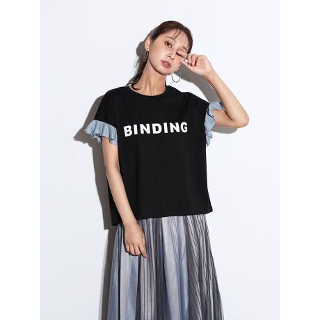 シンプルなロゴプリントに、透け感のあるラメニットのフリル袖をドッキング。