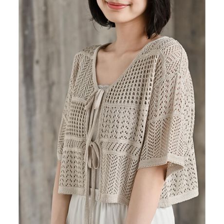 上品な透かし編みが清涼感のあるスタイリングに仕上げてくれるボレロカーデ。