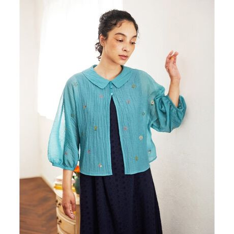 刺繍が大人かわいいブラウスライクなジャケット。たっぷりとした分量感とドルマンスリーブで夏場も涼しく着られるシルエットです。全体に施されたお花や植物の刺繍が、コーディネートに華やかさをプラス。首元にあしらったボタンがアクセントに。ふんわりスリーブで涼しく体型カバーを叶えます。衿付きデザインで日常使いからお出かけまで幅広く着まわせる一枚です。